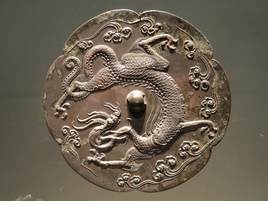 Идущий дракон из позолоченной бронзы период Чжаньго. Зеркала периода Тан.