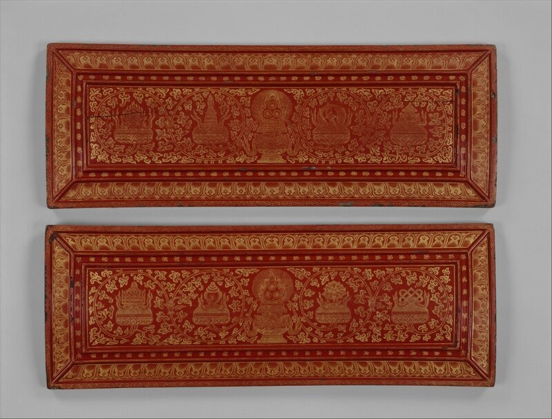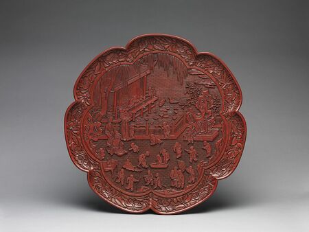 Поднос с фигурами на фоне пейзажа, поднос с цветущей сливой и птицами, черный лак с перламутровой инкрустацией. Коробка с пионами, обложки сутр, красный лак, с инкрустированным золотом. Династия Мин.