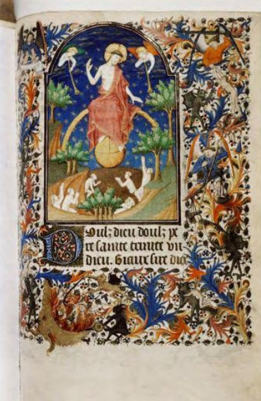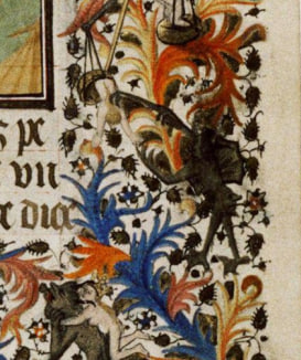 - кролики-воители и улитки-рыцари: гибриды людей и зверей, - шуты, монахи, дьяволята, - сцены охоты, пьянства, бытовых ссор, - абсурдные небольшие сюжеты, никак не связанные с молитвой.