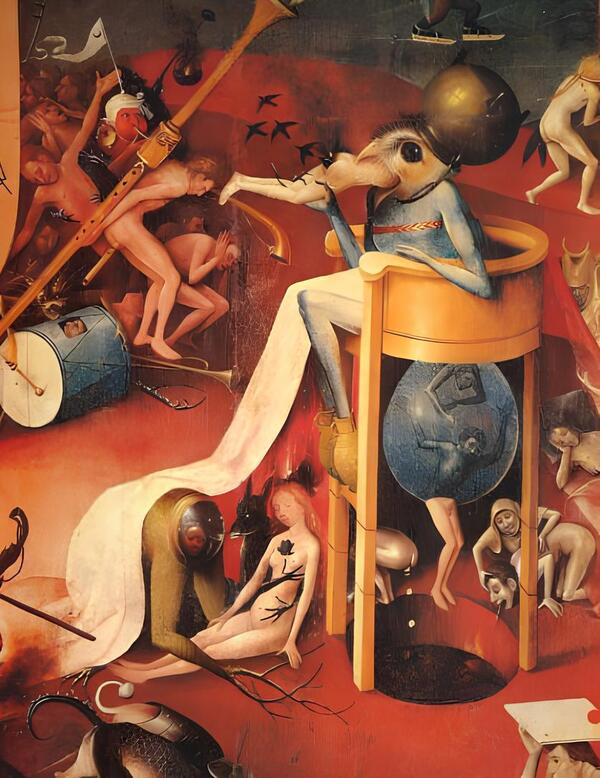 Исследователи показывают, что в адском правом крыле Босха зашифрована метафора самого художественного процесса. Следите за руками: в Италии в XV веке художник — маленький бог, творящий фантазии. У Босха художник — маленький демон, перерабатывающий мир как строительный мусор. Синяя птица — это анти-творец: она не придумывает новые формы, она возвращает старые — только в виде «экскрементального ремикса».