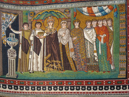 Фрагмент мозаики Юстиниана I в Базилике Сан-Витале, Равенна; Фрагмент мозаики Феодоры. 547 г. Сан-Витале. Равенна, Италия.