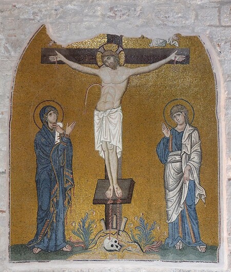 «Распятие Христово», Церковь Успения Богоматери, Дафни, XI век; Богоматерь, фрагмент «Распятия Христово», Церковь Успения Богоматери, Дафни, XI век