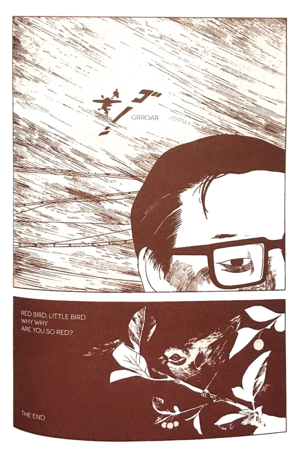 «Red Bird Little Bird» — не совсем «сюжетный» комикс, каким мы привыкли его видеть. Здесь нарратив, по большей части, строится вокруг ощущений: последствия травмы, чувство вины и беспомощности, которые преследуют главного героя.