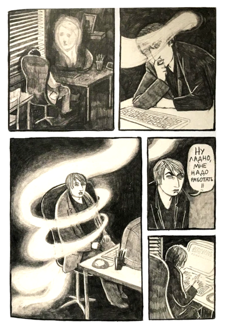 В этом контексте наиболее, по-моему мнению, показательна сцена, где парнтёр героини уходит от неё: помимо того, что внутренне девушка чувствует себя опустошённо, думает о смерти и не понимает, почему её бросили, это также подкрепляется самой визуальной частью. Как и было сказано ранее, она совершенно не заполнена: ни плотными давящими пятнами, ни дополнительной штриховкой. Лишь изредка выделяются либо объекты, либо тень.
