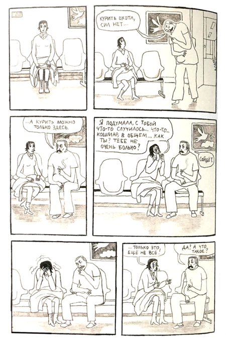 Последующее пребывание героя в больнице достаточно «скучное» и пустое. Джипи не использует ни цвет, ни дополнительные тона, но выполняет всё в «сухой технике», лишь изредка обозначая объекты плотным чёрным цветом. Границы фреймов с использованием такого материала в буквальном смысле «стираются», как стирается и условно разумное в голове Сильвано.