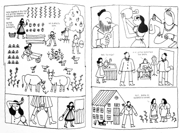 Здесь важно упомянуть, что мать Веры — швея по найму в текстильной компании, и её детство пришлось на голодные послевоенные годы. Отцом она считала неким бесом, поскольку тот тратил последние деньги на выпивку и всё, что оставалось делать, — это молиться: и за себя и за благополучие семьи. Вышивка здесь используется для того, чтобы показать тяжёлое прошлое матери. При этом интересно, что Беа совсем не использует нити других цветов — всё происходящее она иллюстрирует чёрным, иногда выделяя какие-то объекты более плотными пятнами. Это немного напоминает ту линейную графику Джиппи и Гобле, к которой я обращалась ранее, но, конечно, в случае этой истории, она также носит совершенно другой, хотя и близкий характер.