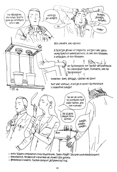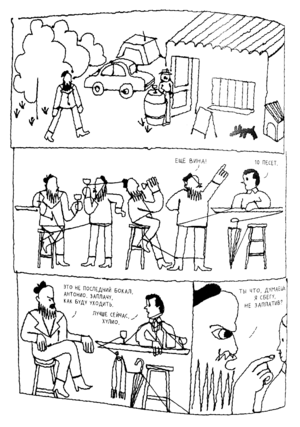 Особый интерес в этом контексте представляют эпизоды, связанные с пребыванием Сильвано в психиатрической клинике. Джипи не только сочетает две техники в пределах одной полосы, но и вводит их в рамках одного фрейма, что лично мне кажется показательным в разделении двух уровней восприятия: мира лечащих врачей и субъективного мира Сильвано, преломляющего происходящее через собственное искажённое восприятие.