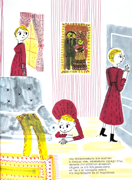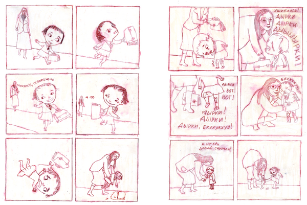 Как мне кажется, такой выбор обусловлен тем, что фломастеры — это достаточно «детский» материал, не требующий особых усилий в освоении, что очень помогает передать ощущения Веры через её собственную призму — призму маленькой девочки, следящей за состоянием матери на протяжении всей своей жизни. При этом моменты, выполненные в более серьёзной технике, к которой я обращусь позже, иллюстрируют уже то, как с миром взаимодействовала непосредственно сама мама.