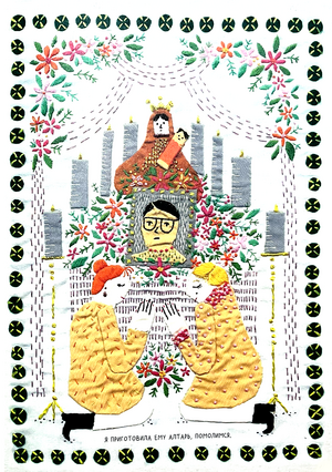 Не менее значимую роль, сопоставимую по заполненности пространства комикса фломастерами, играет сама вышивка.