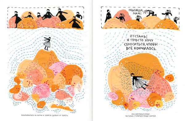 Чтобы ярко проиллюстрировать историю, Беа использовала смешанную технику — сочетание акварели, фломастеров, ручной и машинной вышивки, лоскутного шитья и коллажа.