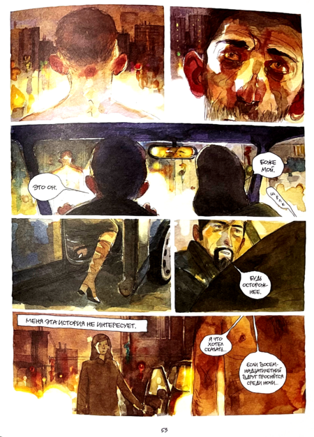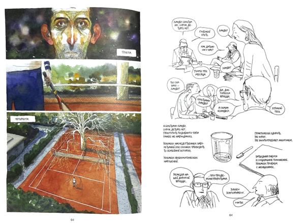 Здесь сочетание мягкой акварели и резких чернильных штрихов намеренно дисгармоничное. Это не та визуальная «норма», которую ожидаешь от комикса, — и именно поэтому она работает: c одной стороны, это позволяет разделить две истории визуально, с другой — показывает, насколько мир человека, страдающего шизофренией, «нестабилен».