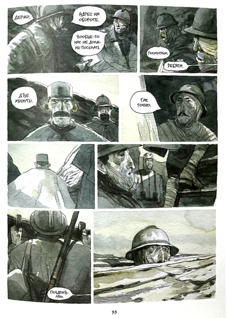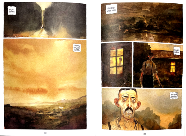 Не менее показательна и акварель, используемая художником. Здесь, помимо того, что она помогает разделить две истории, она так же влияет и на передачу настроения отдельных эпизодов.
