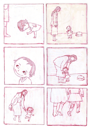 Пролог комикса выполнен с использованием простого, «негромоздкого» материала: Гобле использует линейную графику, которая, с одной стороны, служит некой начальной точкой — воспоминанием маленькой девочки о времени, которая она провела вместе с матерью, достаточно детским и наивным, но с другой — уже показывает этот эпизод жизни Доминик в определённом напряжении. Этот эффект достигается при помощи того, что художница использует ярко красный цвет и «подтёкшие» линии.