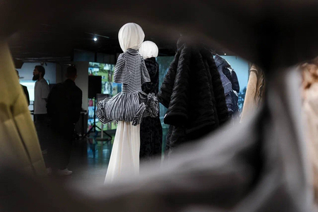 Вместо голов манекенов — белая вуаль. Она выполнена как на картинах Магритта.