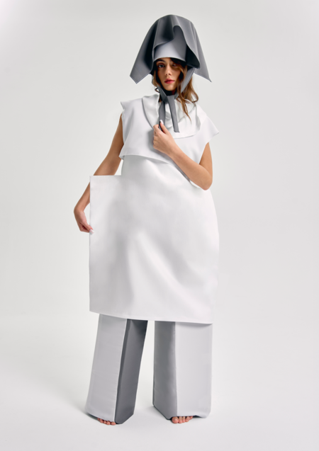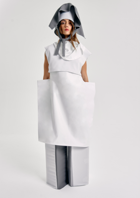 Проект исследует Академию художеств, чьи студенты во время блокады Ленинграда помогали прятать город от взглядов врага. Через фартук я отражаю маскировку, как способ защиты, где человек теряет форму, сливаясь с пространством.